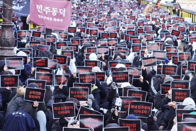 남녀공학 전환 논의에 반발해 싸워온 동덕여대 학생들이 학교 담장을 넘어 거리로 나와 대학본부의 비민주적 행정을 규탄했다. 고등학생, 다른 대학 학생, 일반 시민 등 많은 여성들도 함께 한파 속 거리를 지키며 "국민을 탄압의 대상으로 보는 윤석열과 학생을 탄압의 대학으로 보는 학교 측의 태도는 다르지 않다"고 지적했다.