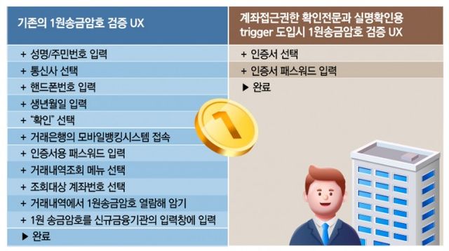 이렇게 되면, 비대면 실명확인 신청자는 수작업으로 기존 거래 은행에 접속해서 1원 송금 암호를 열람하거나, 알림이 서비스로 수신된 1원 송금 입금기록을 열람하여, 신규 금융기관에 수작업으로 그 암호를 입력할 필요가 없어 편리해지기까지 한다. 비대면 실명확인에서의 허점을 제거하면서, 아래 표에서 비교되는 바와 같이, 편의성까지 증진되는 것이다.