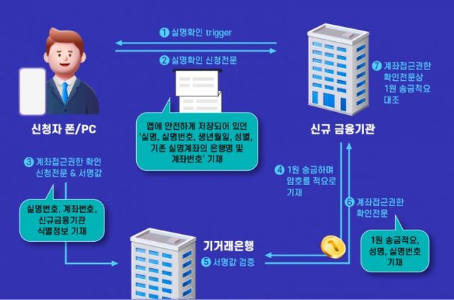 실명확인 신청 전문을 수신한 신규 금융기관은 기존 프로세스와 같이, ‘그 전문에 은행명과 계좌번호가 기재된 기존 실명계좌’로 1원을 송금하며 암호를 적요로 기재한다. (그림에서의 ④)