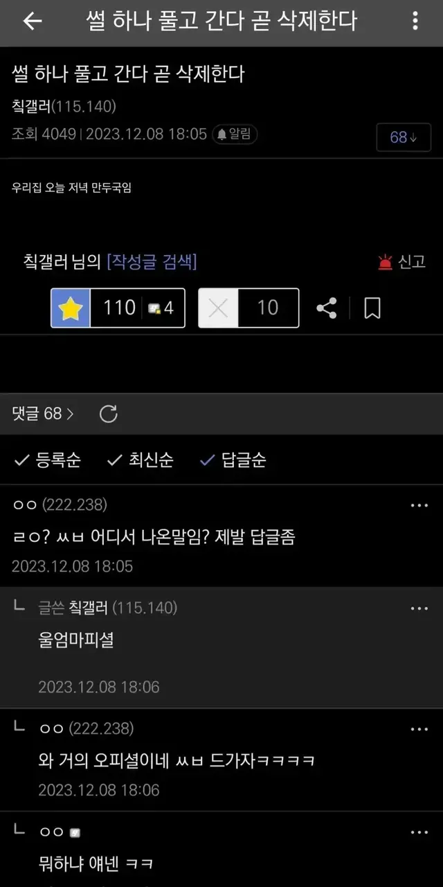 썰 하나 풀고간다 곧 삭제한다
