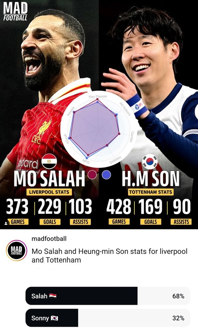 글로벌 축구매체 '매드 풋볼'은 26일(한국시간) 사회관계망서비스(SNS)를 통해 손흥민과 모하메드 살라를 두고 투표를 진행했다.