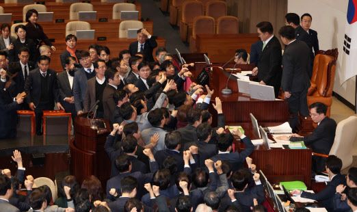최근으로 돌아와 봅시다. 어제(27일) 국민의힘 의원들은 본회의장에서 우원식 국회의장에 항의하는 퍼포먼스를 펼쳤습니다. 의장을 둘러싸고 ‘원천무효’를 외친 것인데요, 한덕수 대통령 권한대행 국무총리 탄핵 의결에 대한 항의였습니다.