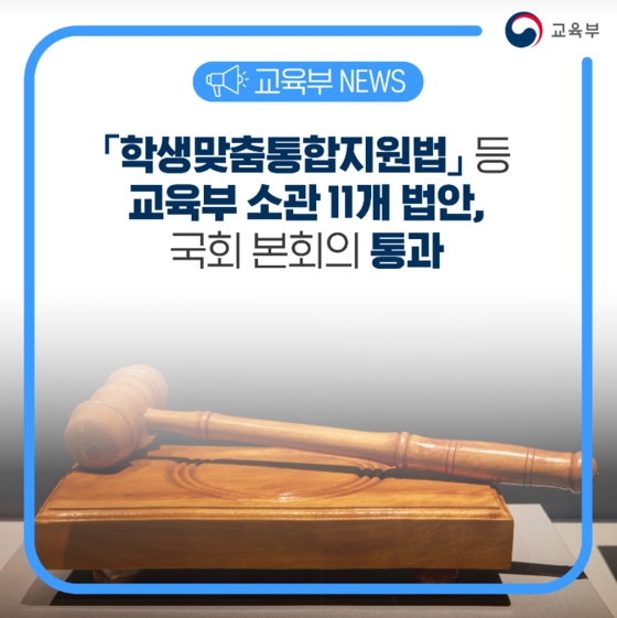 ‘학교맞춤통합지원법’ 등을 비롯해 학생이 겪고 있는 다양한 어려움을 맞춤형으로 지원하기 위한 교육부 소관 11개 법안이 국회 본회의를 통과했다.
