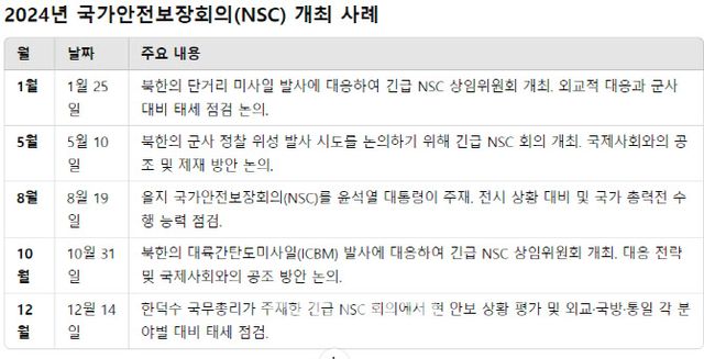 올해에는 1월 25일 북한의 단거리 미사일 발사에 대응하기 위한 긴급 NSC 상임위원회를 시작으로 지난 14일 한덕수 대통령 권한대행 주재 회의까지 다섯차례 열렸다.