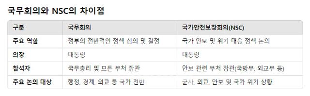 대통령 직속인 국가안전보장회의(NSC, National Security Council)는 수시로 열린다. 국가 안보와 관련된 주요 정책을 논의하고 결정하는 정부 최고 수준의 회의체다. 국가의 생존과 안전을 위협할 수 있는 안보 상황에 대응하기 위한 정책을 수립하고 실행 방안을 논의한다. 의장은 대통령이며 상임위원회 위원은 국가안보실장(상임위원장), 외교부 장관, 국방부 장관, 통일부 장관, 국가정보원장 등 주요 안보 관련 부처의 장관들이다.