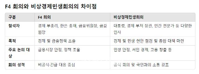특히 최근 들어서는 비상계엄 선포, 국회의 대통령 탄핵소추 등으로 인한 경제 불안을 점검하고 실시간 대응을 위해 주2회 정기적으로 F4 회의를 열고 있다.