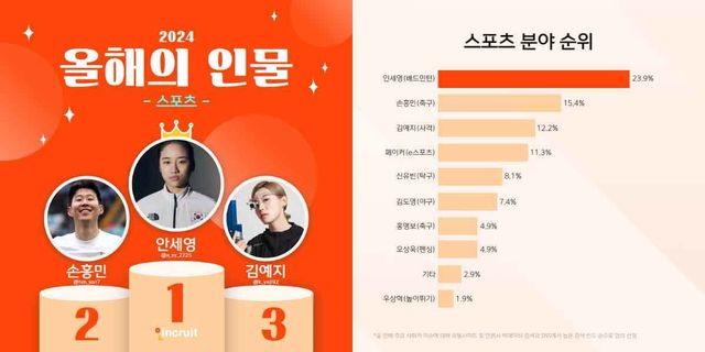 배드민턴 선수 안세영이 손흥민과 김예지, 홍명보 감독 등을 제치고 ‘2024년 올해의 인물’ 조사에서 스포츠 분야 1위에 올랐다. 26일, 취업 플랫폼 인크루트는 ‘올해의 인물’ 결과를 발표했다. 스포츠 분야에서 안세영은 23.9%의 득표율로 1위를 차지했다.