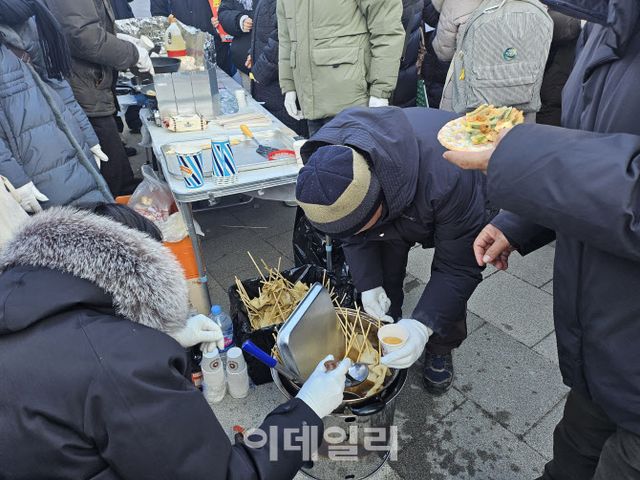 추위 속 따뜻한 나눔도 이어졌다. 거리 곳곳에선 핫팩부터 파전, 어묵, 떡 등을 집회 참가자들과 나누는 시민들이 보였다. 무료로 음료를 나눠주던 커피차도 거리에 나와 시민들에게 커피를 전달했다.