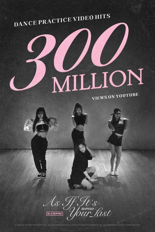 28일 YG엔터테인먼트에 따르면 블랙핑크의 '마지막처럼' 안무 영상은 이날 오전 6시 50분께 유튜브 조회수 3억 회를 넘어섰다. 2017년 6월 24일 공개된 지 약 7년 6개월 만이다.