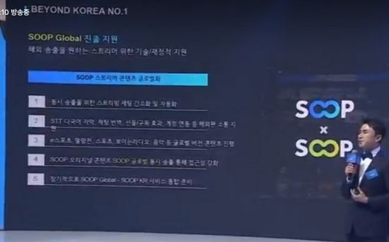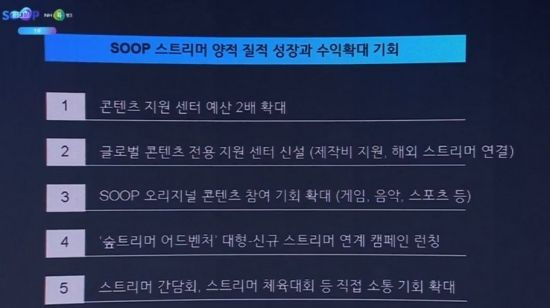 이어 "두 번째로는 글로벌 쪽으로 동시 송출을 하거나 글로벌 쪽 콘텐츠를 진행하는 스트리머분들을 위해 전용 콘텐츠 지원 센터도 마련하고자 한다"라며, "당연히 콘텐츠 제작 지원도 해드리고, 해외 스트리머 섭외도 함께 도움을 드리고자 한다. 더불어 프로모션 마케팅도 같이 도움을 드릴 계획이다"라고 설명했다. 이와 함께 "SOOP에서 진행하는 오리지널 콘텐츠 참여 기회도 더욱 확대해 드릴 예정이다. 게임, 음악, 스포츠 등에 전반적으로 걸쳐서 확대해 드릴 계획이다"라고 약속했다.