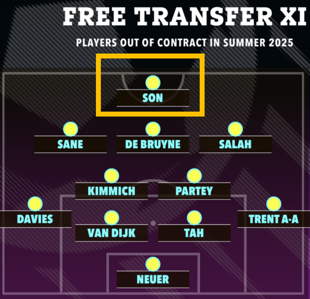 더선은 내년 여름에 이적료 없이 계약할 수 있는 '빅네임' 중 한 명으로 손흥민을 집어넣은 뒤 "계약의 마지막 몇 달을 맞이하는 스트라이커 중 가장 빼어난 선수"라면서 "경험이 풍부한 한국 선수는 자신이 가장 치명적인 마무리 선수 중 하나임을 거듭해서 증명해 보였다. 토트넘에서 활약하는 동안 단 한 번의 트로피도 따지 못했기 때문에 손흥민은 우승을 위해 다른 곳으로 이적할 수 있다"고 했다.