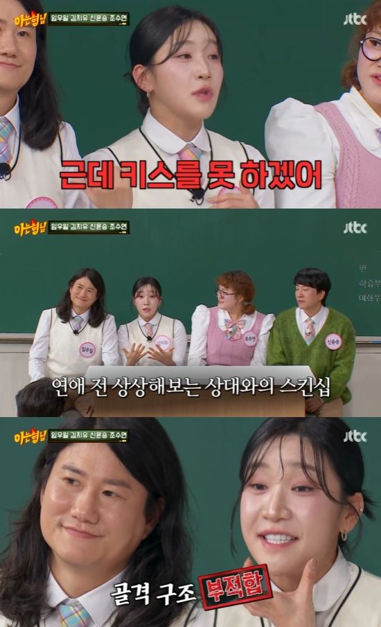 이를 들은 김지유는 "나는 정말 없다고 보는 게 우일이가 정말 멋지거든. 사람이 듬직하고 한결같다. 근데 키스를 못하겠다"라며 단칼에 거절했다. 이어 "연애 상대로 생각하면 스킨십도 상상해보지 않냐. 그런데 우리 둘 다 하관이 비슷해서 스킨십하면 충돌한다"라고 덧붙였다.