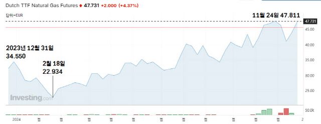 유럽발 가스 공급 감소가 글로벌 천연가스 가격의 상승압력이 될 가능성도 있다. 2022년 러시아가 노트스트림 파이프라인을 통한 가스 공급을 중단한 이후, 유럽 천연가스 가격 지표인 네덜란드 TTF 선물가격은 메가와트시(MWh)당 280유로를 넘어서며 전년 대비 10배 이상 상승했고, 유럽의 가스 수요 증가로 아시아 현물 LNG 가격도 동반 상승해 2021년 대비 2022년 평균가격은 5배 올랐다.