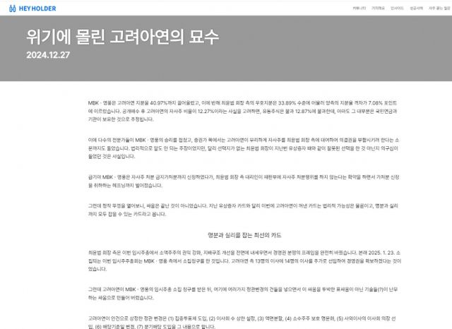 헤이홀더는 마지막으로 "시대 흐름이 소액주주들의 권익을 보장하는 방향, 소액주주들의 목소리에 힘이 실리는 쪽으로 흘러가고 있다"며 "최윤범 회장, MBK·영풍 측 모두 이 전투에서 승리하는 길은 소액주주의 권익 강화 및 지배구조 개선밖에는 없다는 것을 깨달았기를 바란다"고 당부했다.