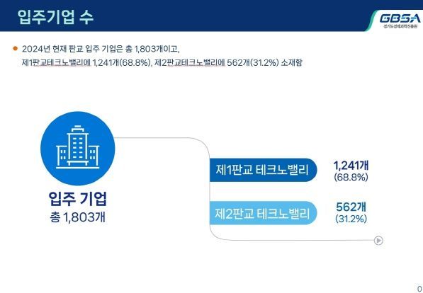 조사에 따르면 제1판교는 입주 기업 1,241개로 전년 대비 4% 증가했고, 제2판교는 입주 기업이 562개로 31% 증가했다. 업종별로는 정보기술(IT)이 전체의 65%로 가장 큰 비중을 차지했고, 생명공학기술(BT) 12%, 문화콘텐츠기술(CT) 9%가 뒤를 이었다. 기업규모별로는 입주기업의 84.3%가 중소기업이며, 중견기업은 7.2%, 대기업은 3.6%로 나타났다.