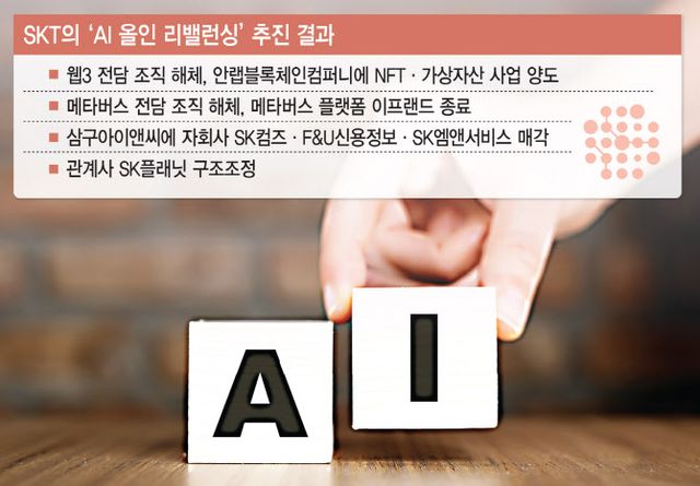 SKT는 ‘글로벌 AI 컴퍼니’ 전환을 가속화 중이며, 이를 위해 전략적으로 비핵심사업을 정리 중이다. 이 같은 기조 아래 이번 조직개편 때 웹3 co뿐 아니라 ‘메타버스 co’도 없어졌다. SKT는 메타버스 플랫폼 이프랜드를 출시 4년 만인 내년 3월 말 종료한다. 최근 SKT는 네이트 운영사 ‘SK커뮤니케이션즈’, 미납 통신요금 추심 대행 업무를 해온 ‘F&U신용정보’, 복지 플랫폼 베니피아 운영사 ‘SK엠앤서비스’ 등 3개 비핵심 자회사 및 손자회사에 대한 매각도 추진 중이다.