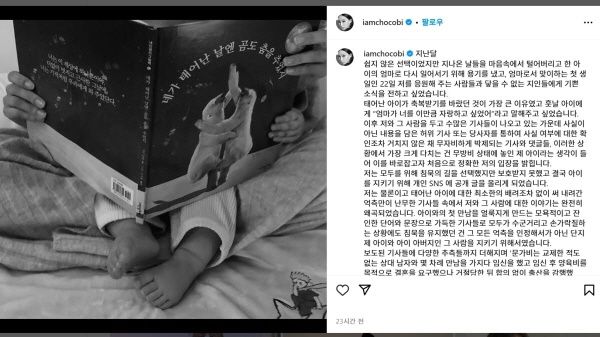 그는 "그 선택에 뱃속의 아이와 함께 설레고 웃고 행복해하던 순간이 분명 있었는데 단순히 현재 두 사람의 모습이 조금은 다른 관계의 형태라는 이유로 이 아이가 실수이며, 성장해 나가며 불행할 것이라 단정 짓는 것은 옳지 않다고 생각한다"고 강조하며 "이 아이는 실수도, 실수로 인한 결과도 아니다. 소중한 생명을 지키고 책임지는 당연한 일에 대해 칭찬받으려는 것도 아니고, 그렇다고 손가락질을 받으려는 것은 더더욱 아니다"라고 강조했습니다.