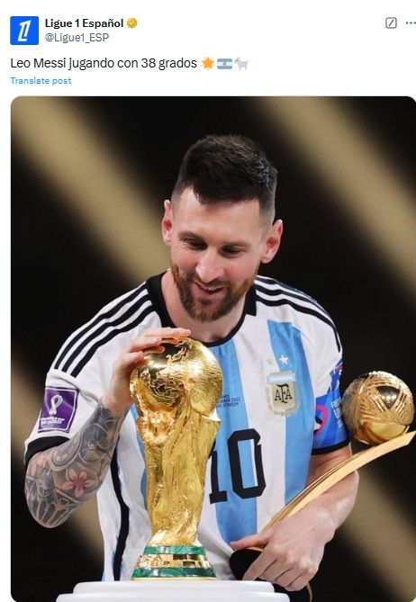 매체에 따르면 프랑스 리그1 스페인 SNS 계정은 호날두의 발언을 접한 뒤 "38도에서 뛰는 리오넬 메시"라며 호날두의 라이벌 리오넬 메시가 2022 카타르 월드컵에서 우승한 사진으로 반박했다.