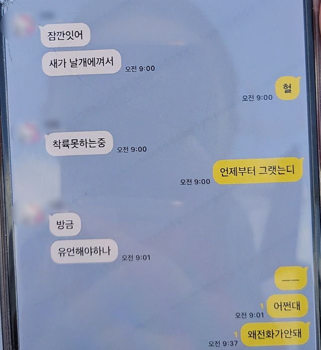 30일 뉴스1에 따르면 태국 방콕공항을 출발해 전남 무안국제공항으로 착륙하려던 제주항공 7C2216편 탑승객 A씨는 오전 9시쯤 공항에 마중 나온 가족에게 “새가 날개에 껴서 착륙 못 하는 중”이라는 카톡을 보냈다.