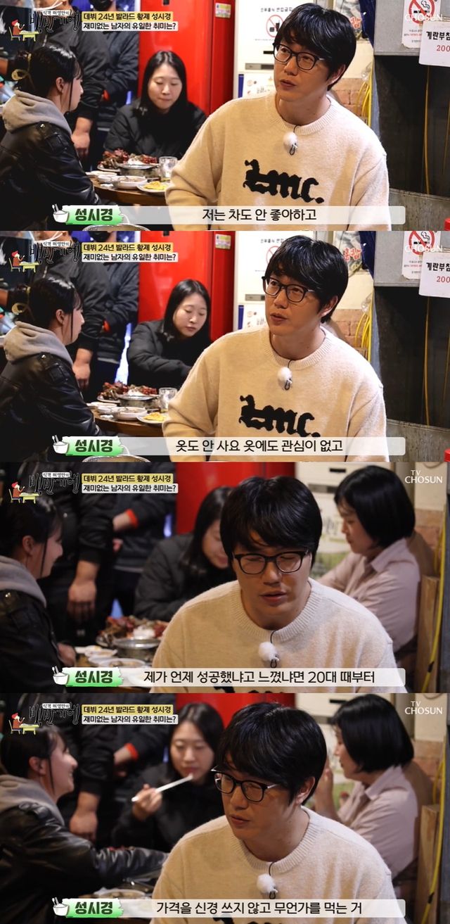 허영만은 "우리 성시경 씨 활동 많이 하셨다. 그 많은 돈 벌어서 뭐하냐"고 물었고, 성시경은 "이런 얘기 처음하는 거 같다. 제가 제 입으로 말씀드리기 뭐하지만 24년을 계속 유명한 가수였다"며 "진짜 재미없는 사람 같다. 저는 차도 안 좋아하고 옷도 안 산다. 시계도 없다"며 비어있는 손목을 직접 보여줬다.