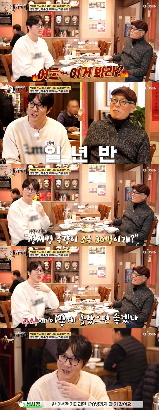 이에 성시경은 "일 년 반이다"고 정정하더니 "얼마전에 누가 나보고 소주 30병 먹는다더라. 그래서 '주식이 이렇게 올랐으면 좋겠다'고 했다. 2년만 기다리면 120병까지 갈 거 같다"고 입담을 뽐냈다.