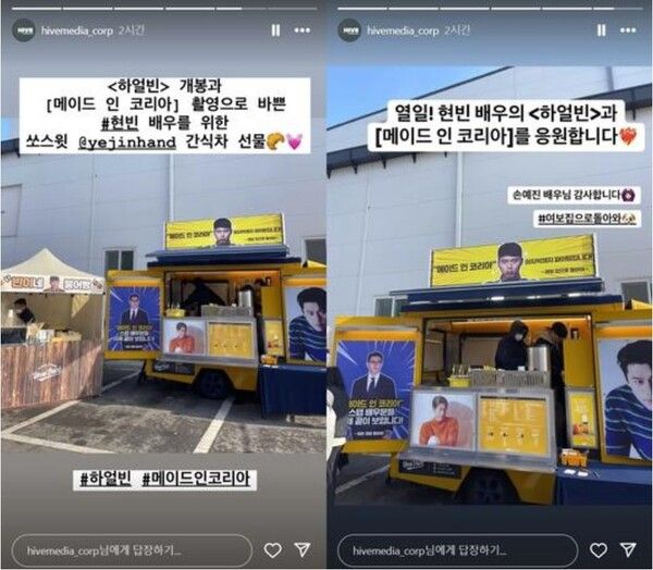 현빈은 최근 영화 ‘하얼빈’ 개봉과 함께 드라마 ‘메이드 인 코리아’ 촬영으로 바쁜 나날을 보내고 있다. 이에 아내 손예진은 남편의 바쁜 일정을 응원하고자 간식차를 선물하며 변함없는 애정을 과시했다.