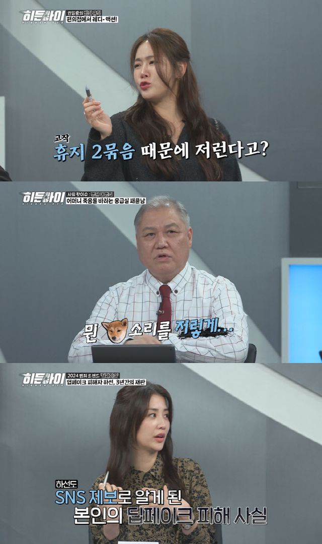 박하선 또한 팬들에게 딥페이크 사진을 제보받았는데, 그걸 보고 “피가 거꾸로 빠지는 기분”이었다고 말했고, 게다가 딥페이크 사진을 만든 사람이 오래전부터 팬이라고 밝혔던 ‘대학교수’였다는 사실을 밝히자 출연진들은 충격에 입을 다물지 못했다.