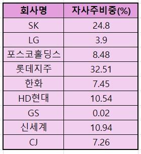 재계 10위권 그룹을 살펴보면 순환출자 구조 등으로 지주사가 없는 그룹을 제외하고 SK(24.8%), LG(3.9%), 포스코홀딩스(8.48%), 롯데지주(32.51%), 한화(7.45%), HD현대(10.54%), 신세계(10.94%), CJ(7.26%) 등 대부분의 지주사가 5% 이상 자사주를 보유 중이다.
