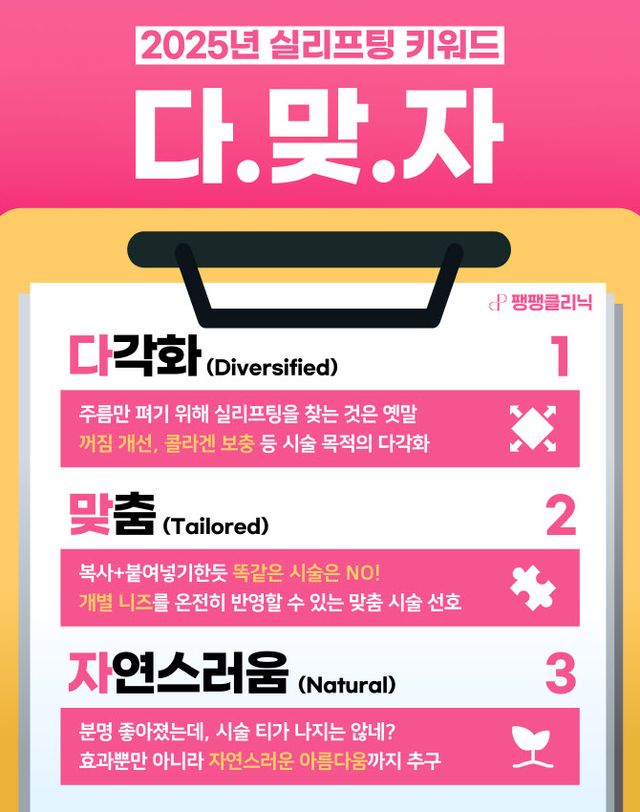 ‘다각화’는 급격히 파편화하고 있는 고객의 유형과 니즈를 반영한다. ‘실리프팅은 노화가 찾아온 사람만을 위한 것’이라는 기존 통념이 약해지고 있다. 2030 고객의 비중이 증가하는 한편, 단순히 주름을 당겨 올리는 것을 넘어 선천적으로 꺼짐이 있는 부위에 볼륨을 채우거나 피부 자체의 콜라겐을 보충하는 등 실리프팅 시술 목적이 다양해지고 있다.