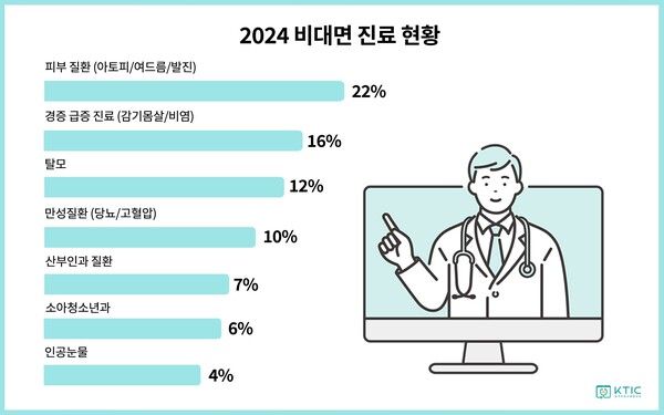 원격의료산업협의회(원산협)가 30일 발표한 '2024 비대면 진료 이용행태 조사'에 따르면, 질환별 이용 현황은 피부 질환이 22%로 가장 높았다. 이어 경증 급여 진료 16%, 탈모 12%, 만성질환 10% 순으로 집계됐다.