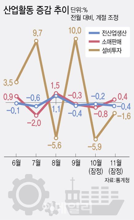 광공업생산은 자동차(-5.4%)와 전자부품(-4.7%)이 감소를 이끌었다. 자동차 생산은 관련 부품 업계 파업이 이어지면서 전월 대비 생산이 7.4% 감소했다. 서비스업에서는 정보통신의 생산이 3.2% 증가했지만, 금융과 보험의 생산이 2.9% 줄었고 수도·하수·폐기물처리 등도5.7%의 감소세를 나타냈다.