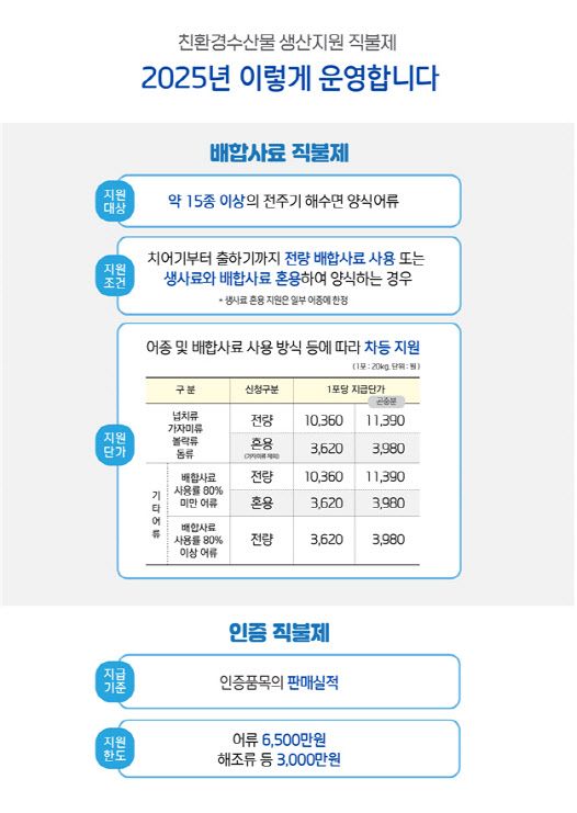 배합사료 직불제는 어가에 친환경 배합사료 구매비용의 일부를 지원한다. 인증 직불제는 친환경 수산물 인증을 받고 위해요소중점관리기준(HACCP)을 준수하며 양식하는 어가에 생산비를 지원해준다.