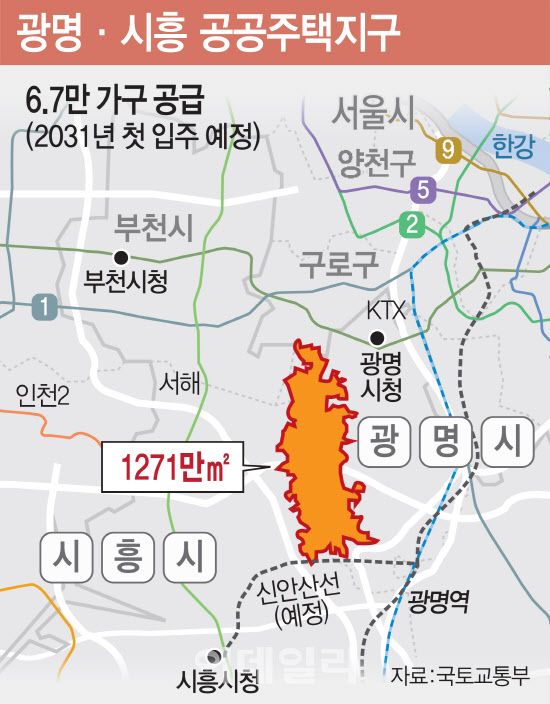 국토교통부는 경기도 광명시·시흥시에 걸쳐 약 1271만㎡ 면적(여의도 4.4배)에 조성하는 광명시흥 공공주택지구(이하 광명시흥 지구)의 지구계획을 승인했다고 30일 밝혔다. 정부는 이곳에 총 6만 7000가구를 공급할 계획이다. 이 중 3만 7000가구를 공공주택(공공분양 1만 3000호, 공공임대 2만 4000가구)으로 건설해 무주택 서민들의 국민 주거안정에 기여할 계획이다.