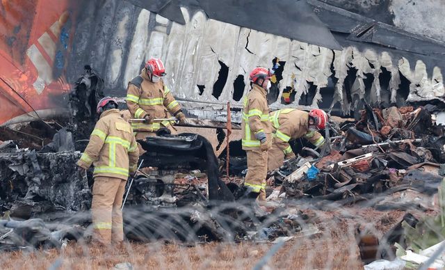 30일 오전 전남 무안국제공항에서 소방대원들이 전날 발생한 제주항공 여객기 충돌 폭발 사고 잔해를 수색하고 있다. / 뉴스1