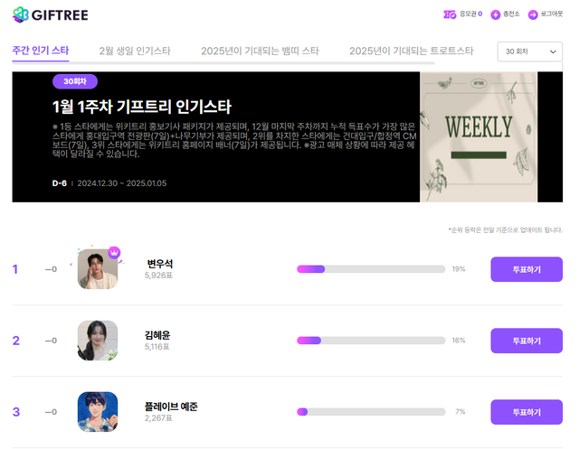 한편 12월 30일부터 진행되는 1월 1주 차 인기스타에서는 기사를 작성하는 현시점 기준으로 변우석이 5,926표로 1위를 차지하고 있으며 김혜윤이 5,116표로 2위, 플레이브 예준이 2,267표로 3위를 기록 중이다.