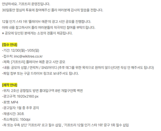 기프트리는 1월 5일까지 홍대입구역 전광판에 노출될 광고 영상을 공모하고 있다. 예준을 응원하는 팬이라면 누구나 영상 제작에 참여할 수 있으며, 당선된 팬에게는 소정의 경품이 제공된다. 해당 영상은 재편집 없이 전광판에 그대로 노출될 예정이다.