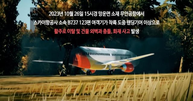 영상에는 '지난해 10월 26일 오후 3시께 망운면 소재 무안공항에서 스카이항공사 소속 B737 123편 여객기가 착륙 도중 랜딩기어 이상으로 활주로 이탈 및 건물 외벽과 충돌, 화재 사고 발생'이라는 사고 상황을 가정한 훈련 장면이 담겼다.