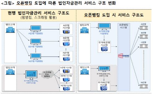 금융위는 “‘오픈뱅킹 법인계좌 조회 서비스’는 중소기업 등 법인의 자금관리 편의성을 제고할 것”이라며 “특히 스크래핑 등을 활용한 방식보다 안정적으로 법인 자금 관리 서비스를 지원할 수 있을 것으로 기대된다”고 했다.