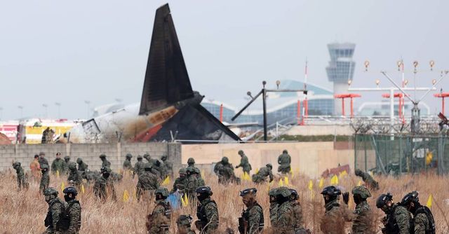 30일 오전 전남 무안국제공항에서 군인들이 전날 발생한 제주항공 여객기 충돌 폭발 사고 잔해를 수색하고 있다 / 뉴스1