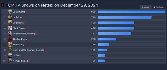 29일, OTT 플랫폼 콘텐츠 총집계 플랫폼 플릭스패트롤은 12월 28일 전세계 TV쇼 순위를 공개했다. '오징어 게임2'는 스트리밍 93개국 중 93개국에서 1위를 기록, 만점인 930점을 최초로 기록해 눈길을 끈다.
