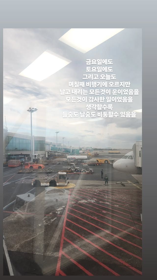 30일 안현모는 "금요일에도 토요일에도 그리고 오늘도 며칠째 비행기에 오르지만 날고 내리는 모든 것이 운이었음을 모든 것이 감사한 일이었음을. 생각할수록 들숨도 날숨도 비통할 수 있음을"이라는 글과 함께 공항에서 촬영한 사진을 올렸다.