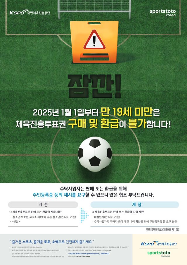 국민체육진흥공단이 발행하는 체육진흥투표권 스포츠토토의 수탁사업자 스포츠토토코리아가 오는 2025년 1월1일부터 체육진흥투표권의 구매환급제한 연령 기준이 변경된다고 30일 밝혔다. ⓒ 스포츠토토코리아