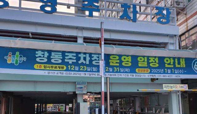 창동공영주차장은 이용객 편의 증진을 위해 옥상 방수 공사 및 도색공사 등 시설 개선 공사를 마무리하여 현재 12월 23일부터 12월 31일까지 1층 무료 임시개방 중이며, 내달 1월 1일부터 전층 정상운영 예정이다.
