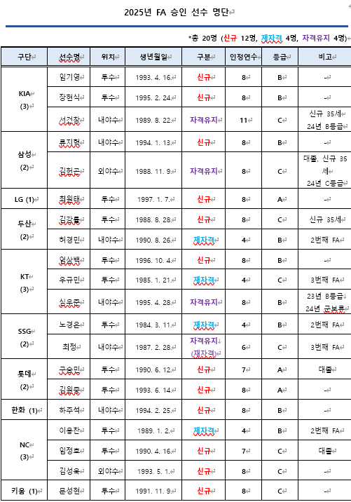 2025년 FA 자격을 얻은 총 30명 중 FA 권리 행사를 신청한 선수는 20명이다. 엄상백(KT 위즈→한화 이글스 4년 78억원) 최원태(LG 트윈스→삼성 라이온즈 4년 70억원) 장현식(KIA 타이거즈→LG 4년 52억원) 심우준(KT→한화 4년 50억원) 허경민(두산→KT 4년 40억원) 김강률(두산→LG 3+1년 14억원)이 FA 이적을 선택했다.