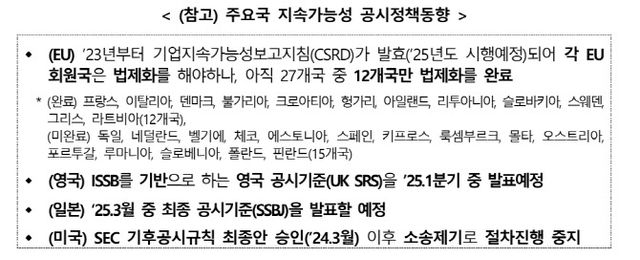 세계적으로 지속가능성 공시를 가장 서두르고 있는 곳은 유럽연합(EU)으로, 내년부터 지속가능성 보고 요건을 강화하는 기업지속가능성보고지침(CSRD)을 시행한다. 다만 EU의 지침은 효력이 발생하려면 EU의 각 회원국이 법제화해야 하는데 금융당국에 따르면 27개국 가운데 프랑스, 이탈리아, 덴마크, 헝가리 등 12개국만 법제화를 완료했다.