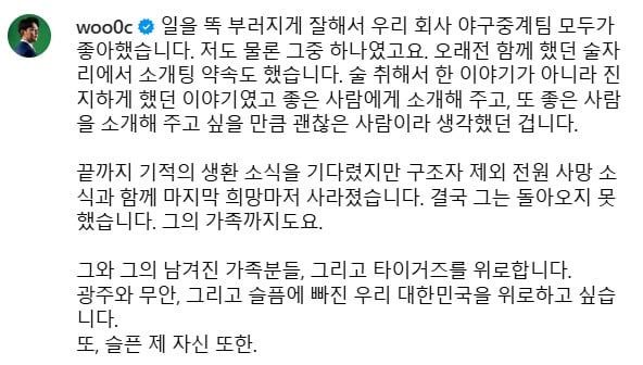 이어 “결국 그는 돌아오지 못했다. 그의 가족까지도. 그와 그의 남겨진 가족분들, 그리고 타이거즈를 위로 한다”며 “광주와 무안, 슬픔에 빠진 우리 대한민국을 위로하고 싶다”고 덧붙였다.