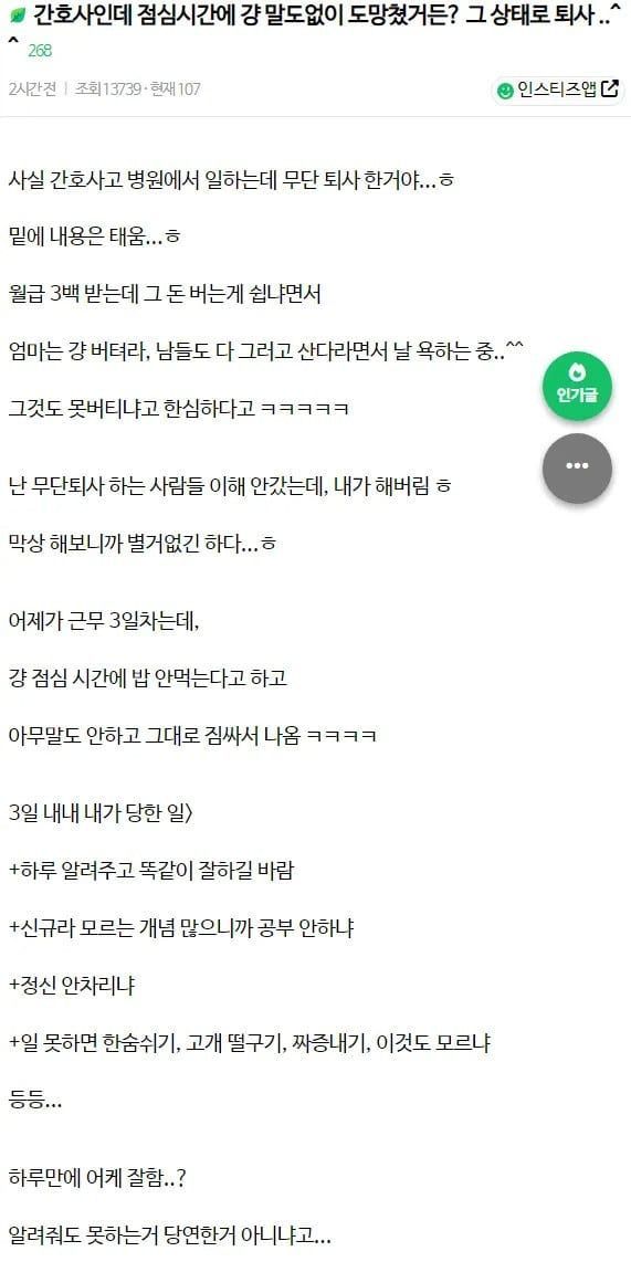 근무 3일차 점심시간에 그대로 무단퇴사한 간호사