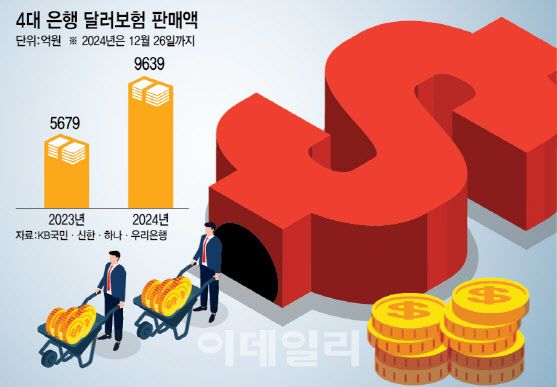 30일 금융권에 따르면 KB국민·신한·하나·우리 등 4대 시중은행이 올 들어 이달 26일까지 달러보험 판매액은 9639억원으로 집계됐다. 작년 연간 판매액(5679억원)과 비교하면 70%가량 증가한 것이다. 판매 건수도 같은 기간 4877건에서 7082건으로 늘었다.