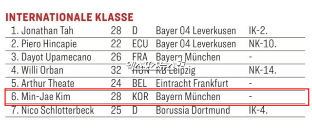 김민재는 국제적인 수준에서도 6위를 차지했다. 요나탄 타와 피에로 인카피에(이상 레버쿠젠)가 1위와 2위를 나눠 가졌다. 김민재 동료 다요 우파메카노가 3위에 올랐고 빌리 오르반(라이프치히), 아르투르 테아테(프랑크푸르트)가 각각 4위와 5위를 차지했다. 그리고 나서야 김민재 이름이 나온다.