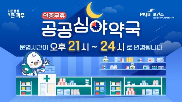 (파주=뉴스영 변영숙 기자) 파주시는 내년 1월 1일부터 공공심야 지정 약국 수를 4개소에 5개소로 늘리고, 영업 시간도 21시부터 24시까지로 변경한다고 밝혔다.